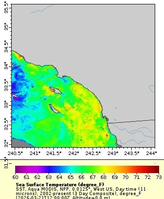 Wed’s Report-April 15 clear skys- cooler nights- light south wind 3 4 kts Water Temperature (WTMP):66.2 °F degrees , bait barge is in Newport now—Sardines bait - Coastal water has a light milkish green color to it—Downhill current