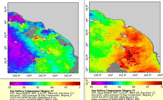Water temps from 55 to 70 degrees shows a marked difference from last year April 2025 (Left) to this year 2026 ( right)
